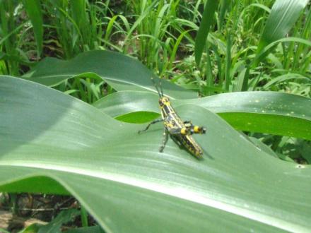 One of the pests, a grasshopper. The biggest pest to producers throughout the Province Equateur and the Province Oriental is the weaver bird which in flocks can ravage entire fields.